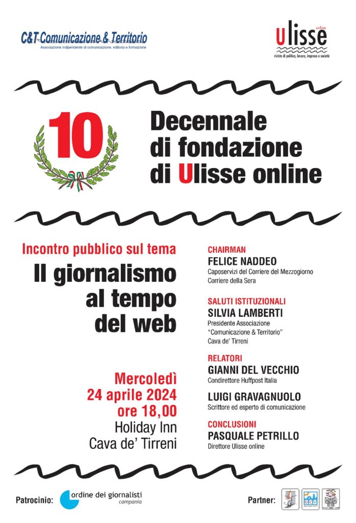 In occasione del decennale di attività della rivista web Ulisse online, l’associazione Comunicazione & Territorio, proprietaria della testata giornalistica, organizza un incontro pubblico sul tema Il giornalismo al tempo del web, che si terrà il prossimo mercoledì 24 aprile, alle ore 18, presso l’Holiday Inn di Cava de’ Tirreni.