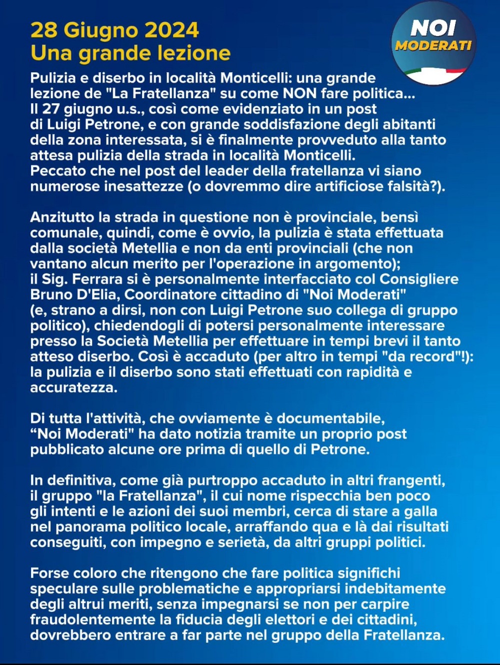 Di tutta l’attività, che ovviamente è documentabile, “Noi Moderati” ha dato notizia tramite un proprio post pubblicato alcune ore prima di quello di Petrone.