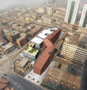 Il serpentone era copiato in parte da un progetto che Casamonti aveva realizzato in Cina nella città di Tianjin (sopra nella foto), moderna megalopoli. Questo per rappresentare l’assoluta inadeguatezza del progetto per un centro storico come quello di Cava de’ Tirreni, progetto, tra l’altro incompatibile con il Puc in vigore e con il nuovo che poi sarebbe stato adottato. Questi i fatti, se l’amministrazione avesse fatto notare a MST che l’immobile storico andava restituito, non avrebbe potuto autorizzare in pompa magna la presentazione di quel progetto.