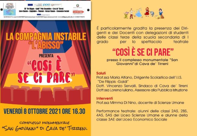 “Così è se ci pare”. E’ il titolo del Modulo, del più ampio Progetto “A tempo di scuola! Che passione!” (cod . 10.1.1A-FSEPON-CA-2021-527), che il Liceo De Filippis Galdi ha portato a compimento con uno spettacolo ideato e diretto dalla professoressa Mimma Di Nino, esperto del PON e docente di Scienze Umane, coadiuvata dalla collega tutor, professoressa Antonella Sellitti.