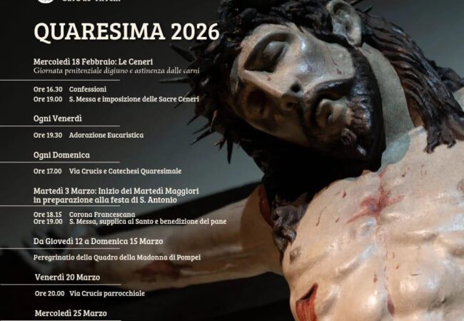 Il Convento-Santuario di San Francesco e Sant’Antonio ha diffuso il calendario degli appuntamenti per la Quaresima 2026, un percorso spirituale che coinvolgerà l’intera comunità cavese a partire da mercoledì 18 febbraio, giorno delle Ceneri. La giornata penitenziale, segnata dal digiuno e dall’astinenza dalle carni, si aprirà alle 16.30 con le confessioni e proseguirà alle 19.00 con la Santa Messa e l’imposizione delle Sacre Ceneri.
