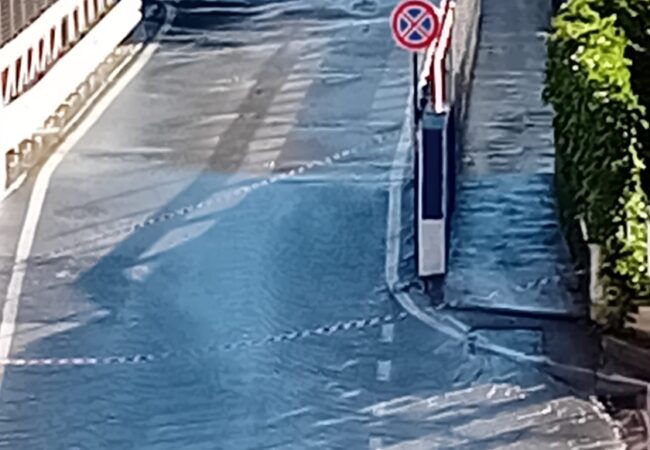 Cava de’ Tirreni, rottura alla condotta idrica in via Santoro: un fiume d’acqua scende dal ponte sull’autostrada verso il trincerone