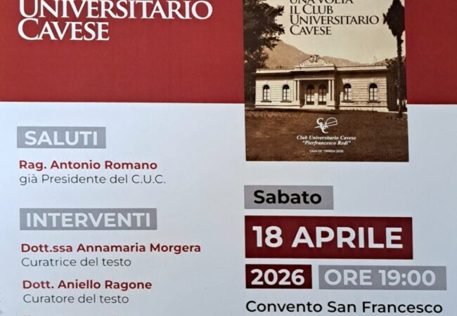 Il prossimo sabato 18 aprile, alle ore 19:00 presso il Convento di S. Francesco e S. Antonio di Cava de’ Tirreni, sarà presentato il libro “C’era una volta il Club Universitario Cavese”, di Annamaria Morgera e Aniello Ragone.