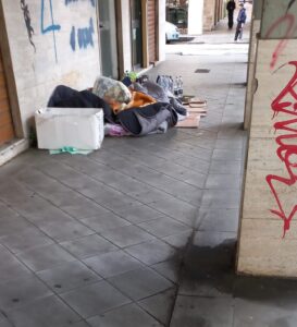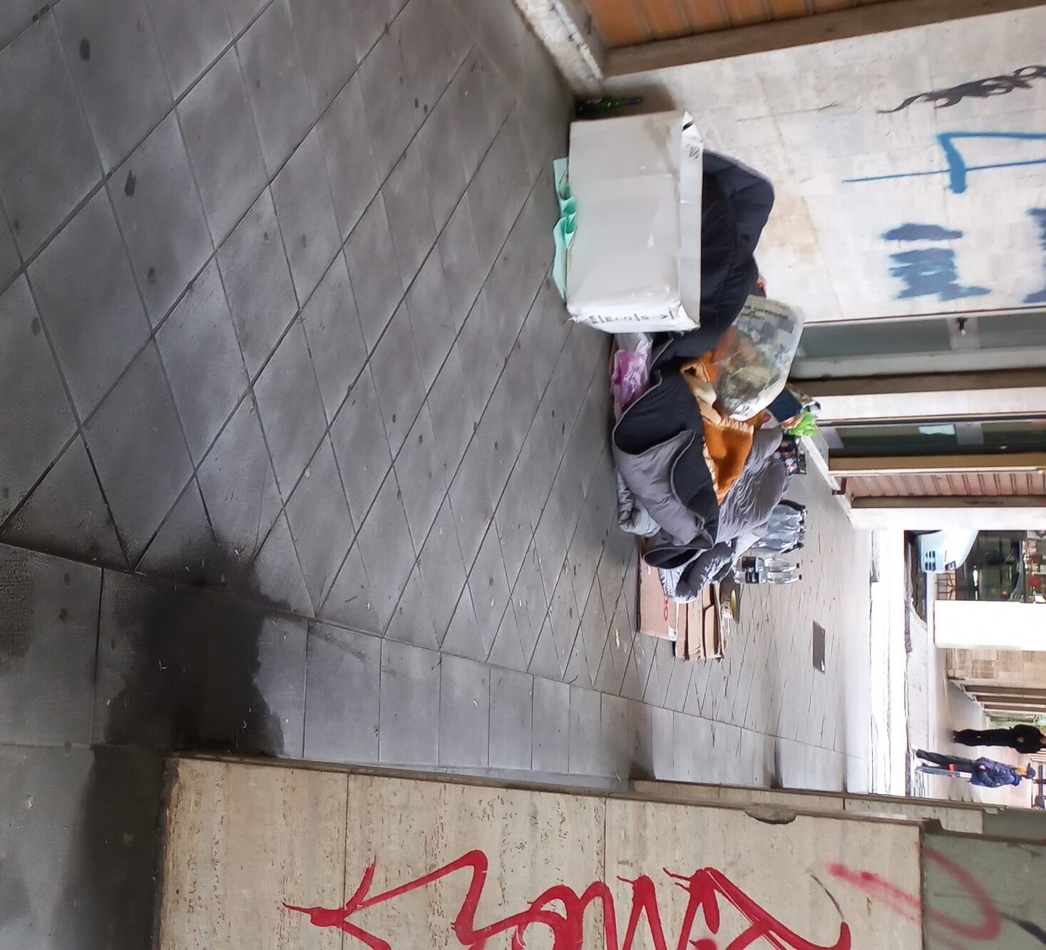 Cava de’ Tirreni, situazione igienica fuori controllo per un barbone sotto i portici di via Tafuri