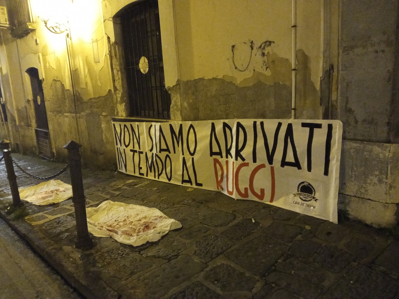“Protesta shock dell’Uroboro, associazione che opera sul territorio cavese nell’ambito socio culturale. Questa mattina infatti nei pressi dell’ospedale sono comparsi cadaveri finti a terra, coperti da lenzuola sporche di sangue e uno striscione che recitava “non siamo arrivati in tempo al Ruggi””.