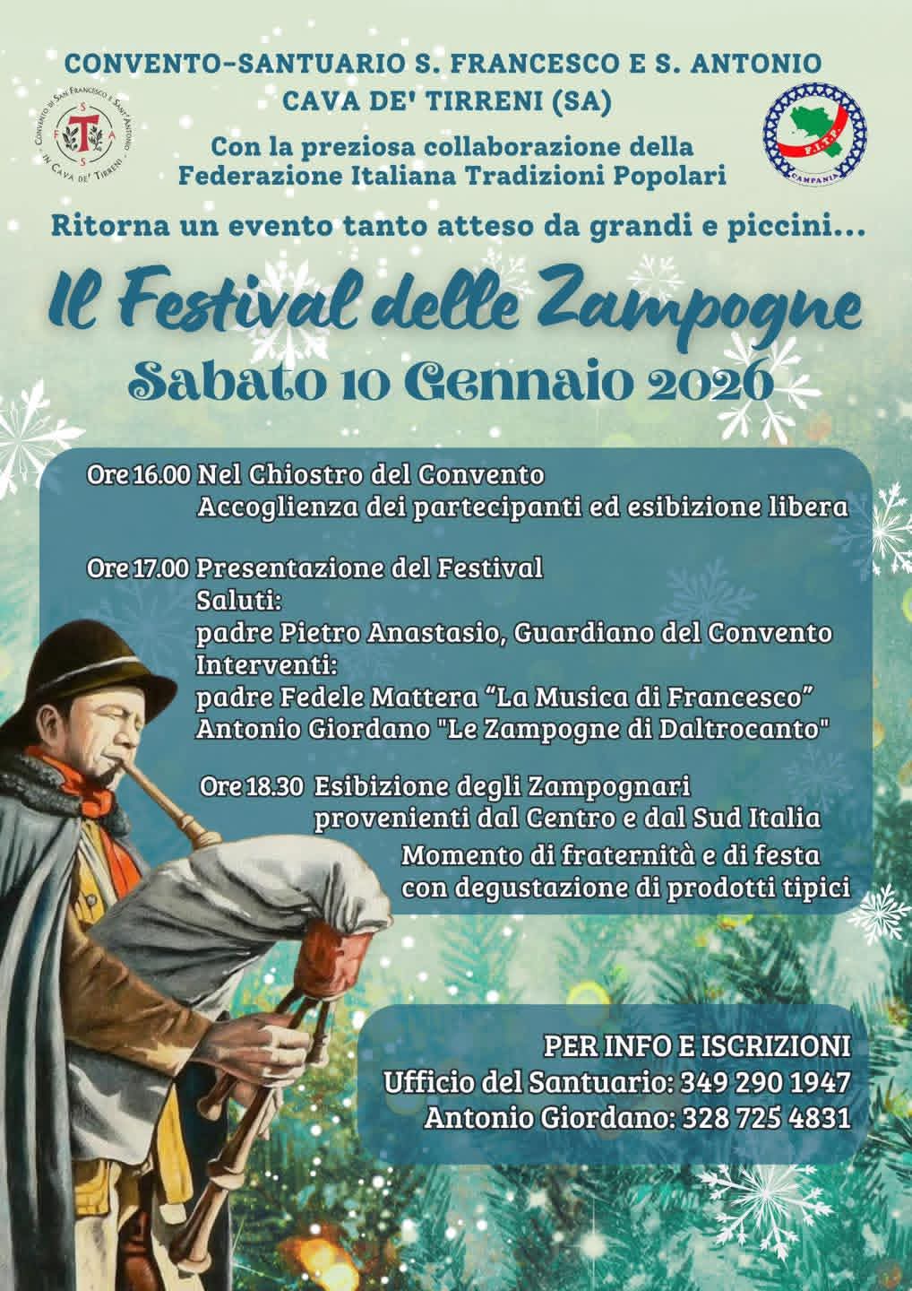 Il prossimo 10 gennaio il complesso francescano ospiterà la nuova edizione del "Festival delle Zampogne", un pomeriggio tra musica pastorale, cultura e sapori tipici del Sud Italia