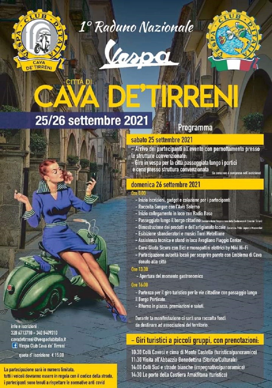 Mancano meno di due settimane al 1° Raduno Nazionale Vespa organizzato dal Vespa Club di Cava de’ Tirreni, che si terrà con un fitto programma di eventi nelle date del 25 e 26 settembre.