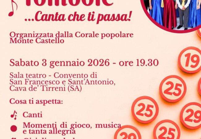 Una serata all’insegna della tradizione, della convivialità e della partecipazione comunitaria. È questo lo spirito di “Tombolé… Canta che ti passa!”, l’evento organizzato dall’Associazione culturale Corale Popolare Monte Castello, in programma sabato 3 gennaio 2026 alle ore 19.30 presso la Sala teatro del Convento di San Francesco e Sant’Antonio a Cava de’ Tirreni.