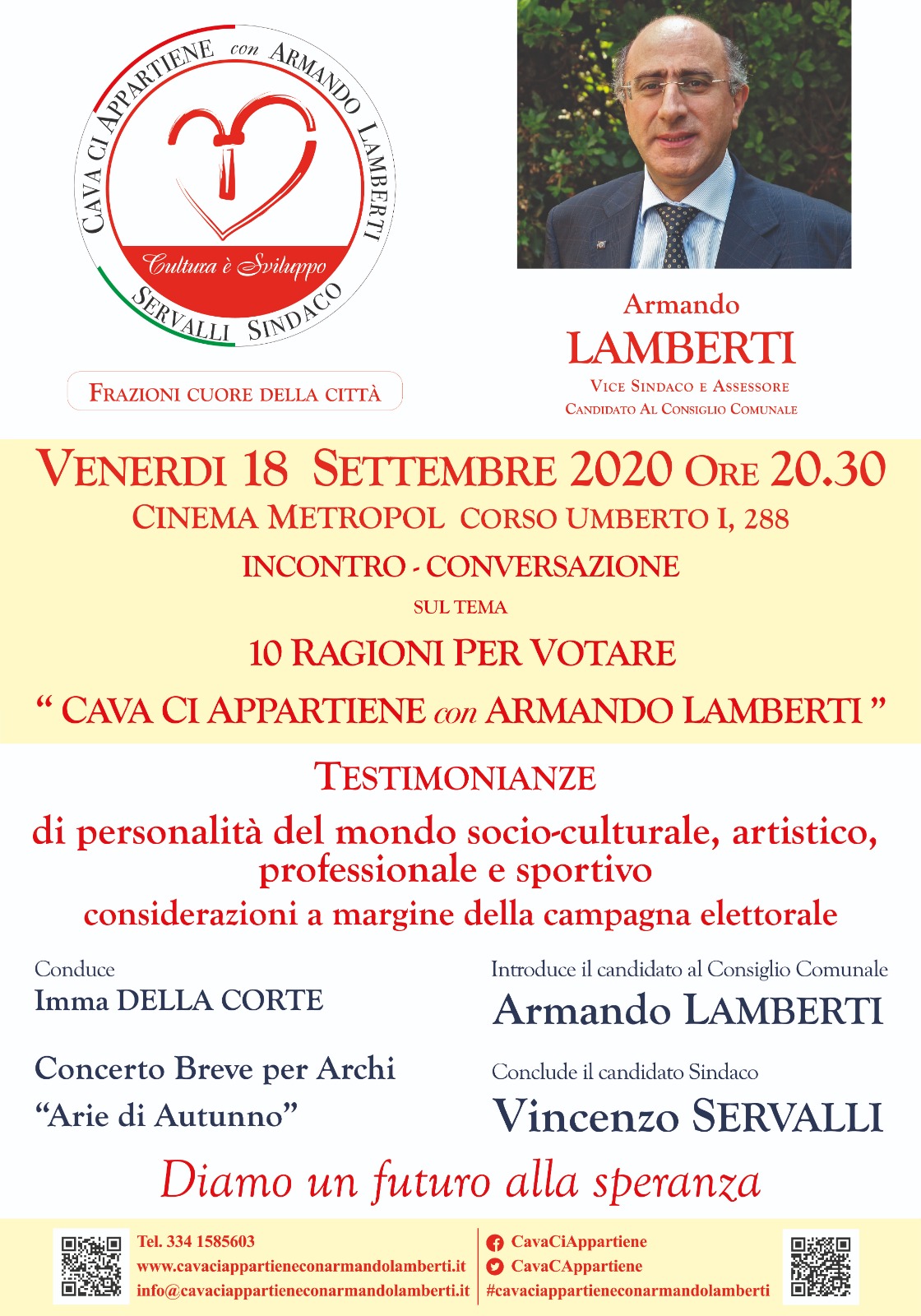 Infine, segnaliamo la manifestazione di Armando Lamberti che, pur non essendo candidato a sindaco come la scorsa volta, organizza la chiusura della sua campagna elettorale al Consiglio comunale domani alle 20.30 presso il Cinema Metropol, dove ad essere protagonista oltre a lui sarà ovviamente il candidato sindaco Vincenzo Servalli.