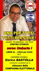Appuntamento nel Centro Storico per il candidato Enrico Bastolla, supportato dalle liste Liberi di… e Cava per Cava. Bastolla incontrerà i cittadini alle ore 19.00.