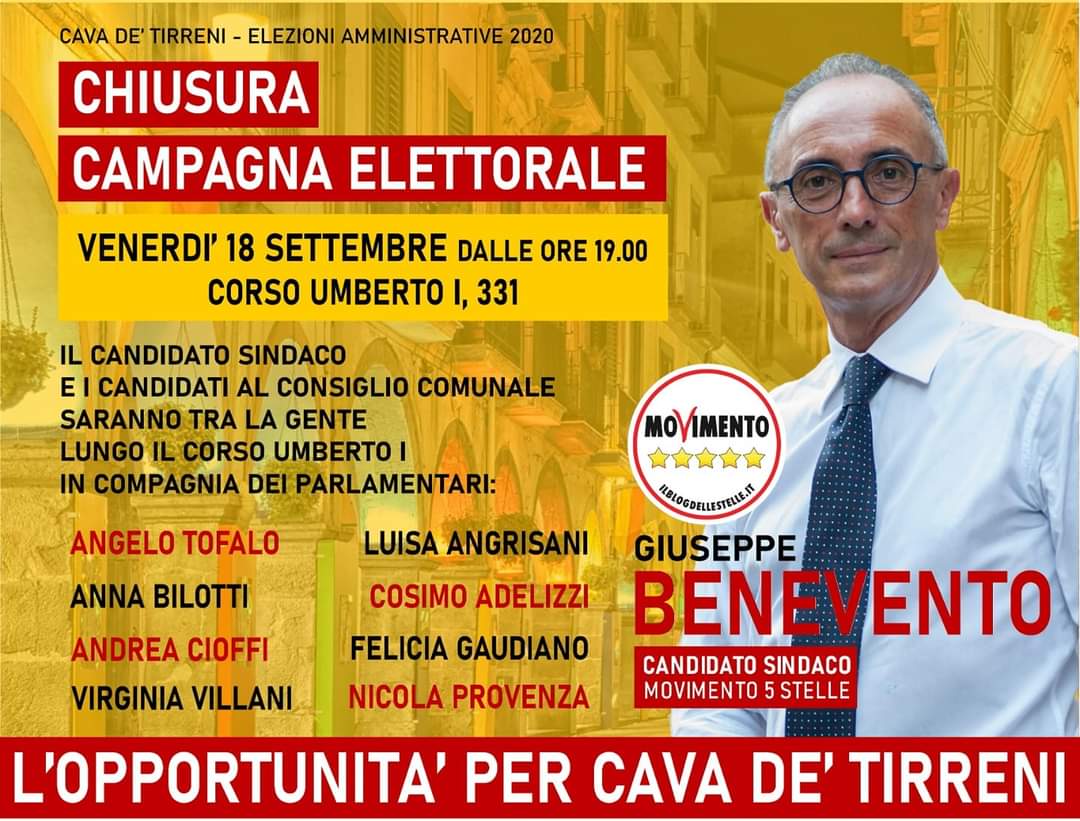 Stessa location per Giuseppe Benevento del Movimento 5 Stelle, il quale sarà lungo il Corso Umberto I dalle ore 19.00.