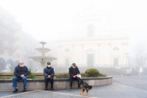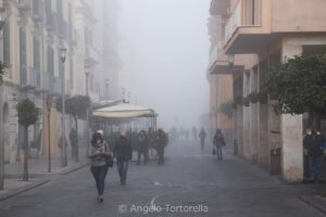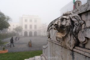 E così possiamo vedere i nostri bei portici “annebbiati”, bambini con le mamme e ragazzi con lo zaino che vanno a scuola, covid permettendo, gli anziani che anche con la nebbia non rinunciano alla loro seduta ai bordi della fontana dei delfini a piazza Duomo, e poi piazza Abbro con il Comune, il Palazzo di Città avvolto nella nebbia, che non può che richiamare alla mente un’espressione giornalistica molto famosa: il porto delle nebbie.