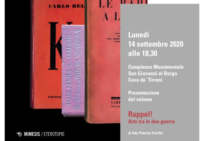 Lunedì 14 settembre 2020 alle ore 18,30 presso il Complesso Monumentale di San Giovanni al Borgo di Cava de’ Tirreni (C.so Umberto I, 167) sarà presentato il volume Rappel! Arte tra le due guerre di Ada Patrizia Fiorillo, Edizioni Mimesis 2019.