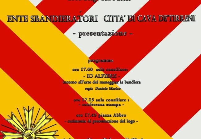 Presentazione ufficiale per l’Ente Sbandieratori Città di Cava de’ Tirreni. Il battesimo per la neonata associazione folcloristico-culturale sarà il prossimo 28 ottobre, alle ore 17 presso l’Aula consiliare del Palazzo di Città.