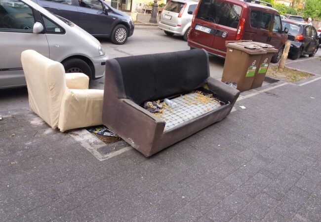 Questi divani giacciono abbandonati affianco a un bidone dell’umido in Corso Mazzini, poco distante dal complesso residenziale del Parco Beethoven.