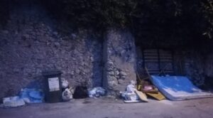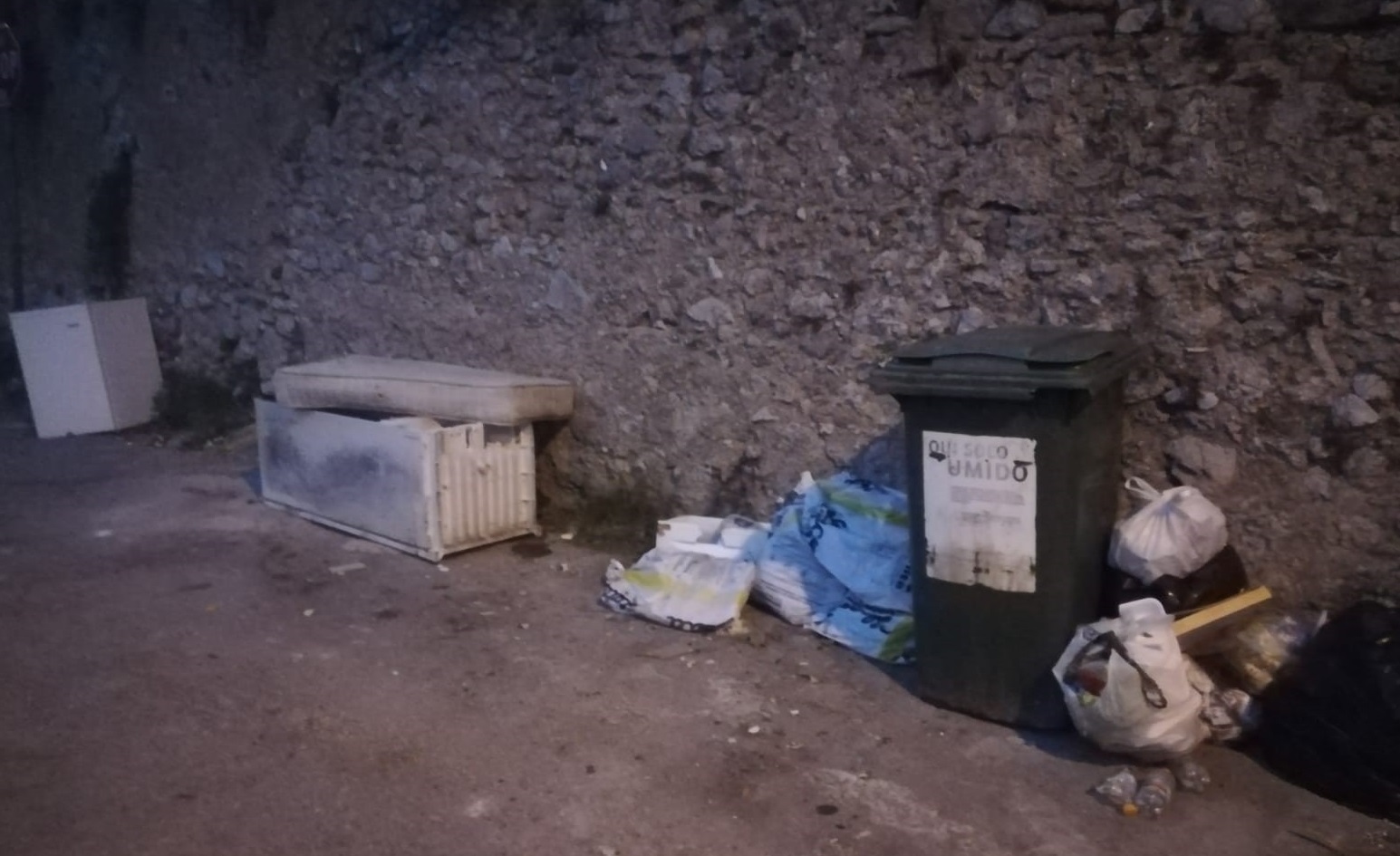 Sempre nella stessa postazione, vicino al bidone dell’umido, e sempre rifiuti ingombranti di ogni genere. Anzi, questa volta in doppia dose. Due materassi con tanto di rete con doghe in legno, due frigoriferi, misure standard e mini, e poi sacchi con materiale per l’edilizia e roba varia.
