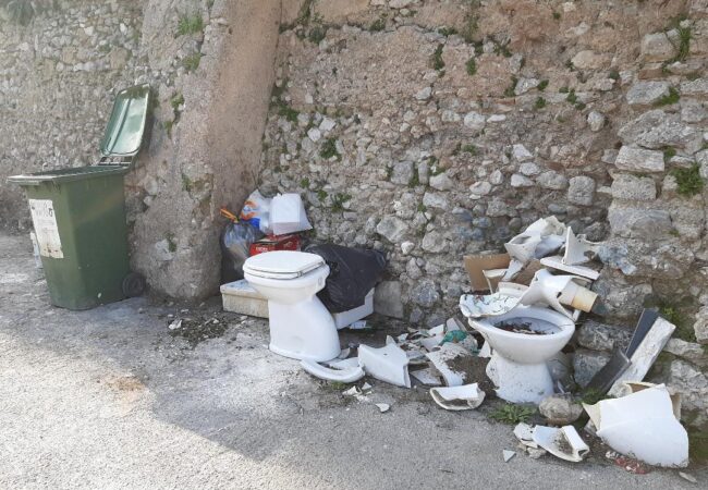 Qualcuno, la foto è di oggi pomeriggio, ha lasciato due water interi, più uno in frantumi, e un piatto per doccia vicino al bidone per la raccolta dell’umido, trasformando l’angolo in discarica a cielo aperto.