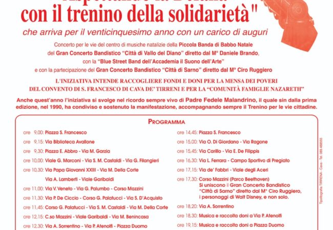 Il percorso del Trenino per le strade cittadine prevede diverse soste durante le quali verranno raccolti i doni. Alle 17,30 presso il Parco Beethoven salirà sul Trenino il Gran Concerto Bandistico “Città di Sarno”.