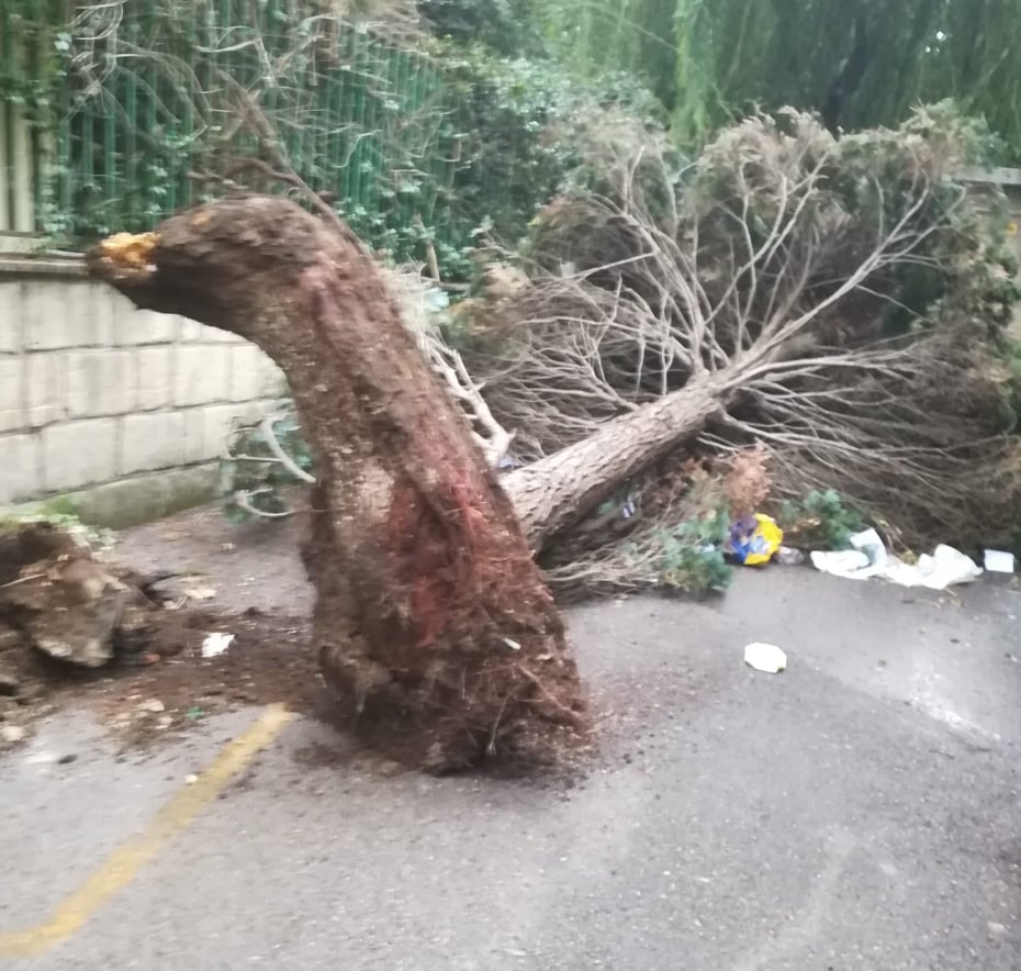 Un albero è stato sradicato dalla violenta pioggia e dal vento in via Onofrio Di Giordano.