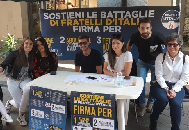 La sezione cavese di Fratelli d’Italia è stata impegnata per la giornata di domenica nella raccolta firme per sostenere le quattro proposte di legge di iniziativa popolare lanciate dalla leader del partito Giorgia Meloni, con la presenza dell’Onorevole Edmondo Cirielli e del Senatore Antonio Iannone.