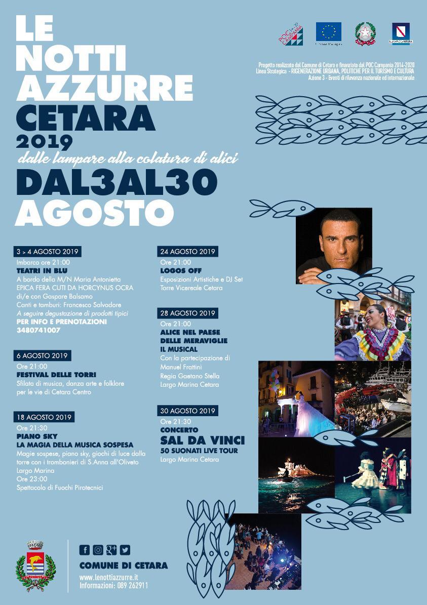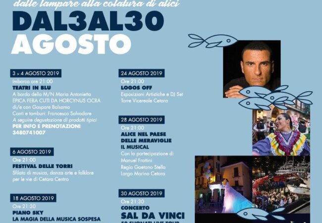 Nell’ambito della rassegna LE NOTTI AZZURRE CETARA “dalle lampare alla colatura di alici” prosegue il viaggio con “Teatri in Blu”, a cura di Erre Teatro. A partire dalle 21, martedì 6 agosto, una sfilata di musica, danza, arte e folklore animerà le vie di Cetara, in occasione del “XXX Festival delle Torri”. In Largo Marina, dalle 21:30 di domenica 18 agosto, sarà la volta di “Piano Sky, la magia della musica sospesa”, per una serata che si prospetta essere unica nel suo genere, durante la quale una dama (pianista) si eleverà a 3 metri di altezza, per stupire e affascinare tutti gli ospiti, con note d’incanto e brani celebri. Tra magie, piano sky e giochi di luce dalla torre, realizzati dai Trombonieri di S. Anna all’Oliveto, la notte si concluderà con lo spettacolo di fuochi pirotecnici, a cura di Senatore Fireworks. Dopo il successo della scorsa edizione, ritorna Logos Off, tra dj set e videoproiezioni, sabato 24 agosto, dalle 21, nella suggestiva cornice della Torre Vicereale.