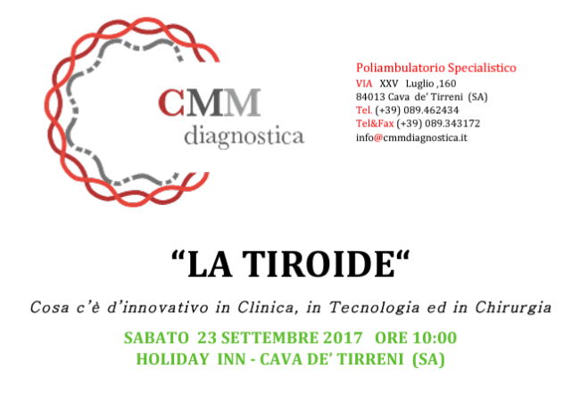 Importante appuntamento medico-scientifico questo fine settimana a Cava de’ Tirreni. Sabato 23 settembre alle ore 10, presso l’hotel Holiday Inn si terrà il convegno “La Tiroide”- cosa c’è d’innovativo in Clinica, in Tecnologia e in Chirurgia.