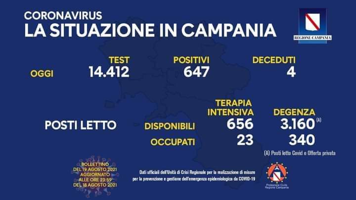 Questi i dati relativi ai casi di contagio di coronavirus alle ore 18 di ieri giovedì 19 agosto 2021.