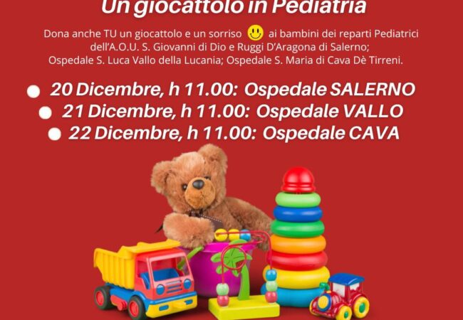 Torna anche quest’anno “Dona un sorriso – Un giocattolo in Pediatria”, l’iniziativa solidale promossa da Donation Italia in collaborazione con una fitta rete di associazioni del territorio, unite dall’obiettivo di portare gioia e conforto ai bambini ricoverati nei reparti pediatrici della Provincia di Salerno.