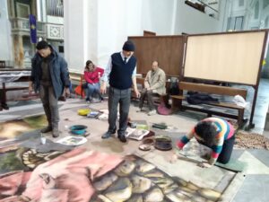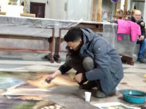 A Minori fervono i lavori di allestimeto del “Tappeto” nella Basilica di S. Trofimena ad opera dell’artista Giacomo Palladino, con la collaborazione di due giovani promesse dell’arte del “Sepolcro”, Alessia Galibaldi e Stefano Liotti.