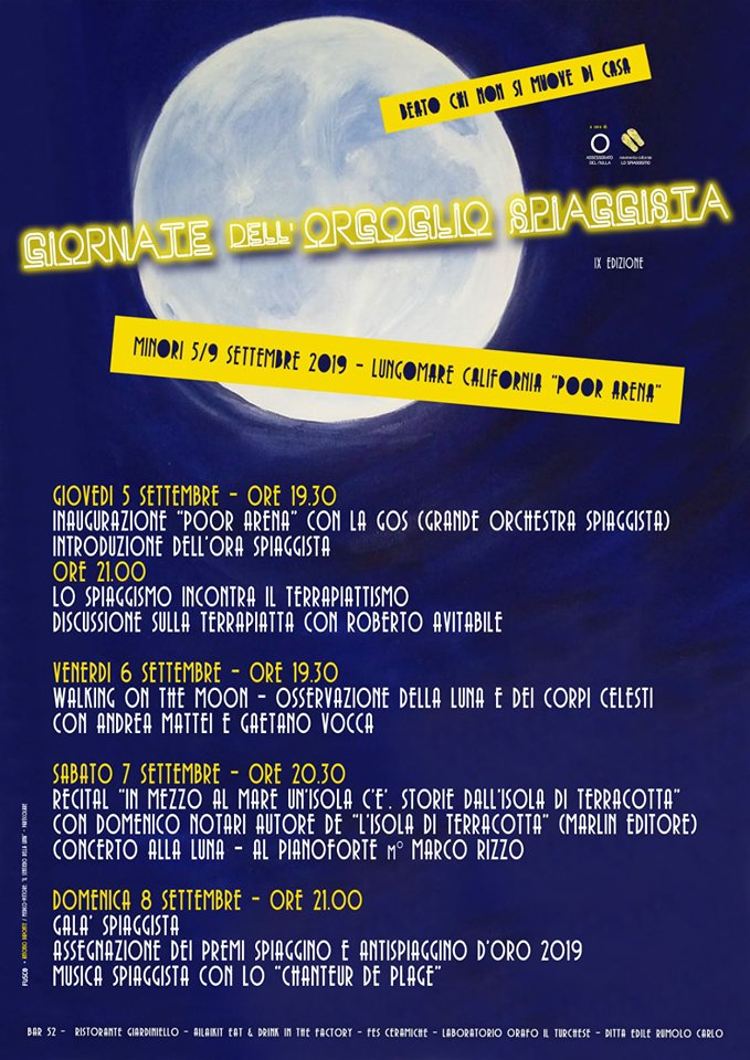 In occasione del cinquantenario dello sbarco sulla luna, queste giornate saranno dedicate al tema dello spazio (cosmologico) e del tempo (cronologico) ed avranno come motto: “Beato chi non si muove da casa”. Giovedi 5 Settembre ci saranno due appuntamenti clou della rassegna: dopo l’inaugurazione della “Poor Arena” con la musica della GOS (Giovane Orchestra Spiaggista) ci sarà la tanto attesa introduzione dell’ora spiaggista che andrà a sostituire sia l’ora legale (attualmente in uso) che quella solare; a seguire l’incontro con le teorie del terrapiattismo che saranno esposte da uno dei massimi esponenti italiani: Roberto Avitabile. Nella serata di venerdì gli spiaggisti cercheranno di fugare ogni dubbio sulla terra piatta o sferica, con l’osservazione, tramite telescopio, della luna e dei corpi celesti alla presenza di Andrea Mattei e Manuel Vocca.