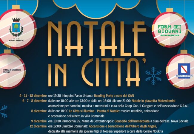 Il calendario prende avvio il 4 dicembre con il “Reading Party” al Parco Urbano “Nuceria Città Archeologica” e prosegue con mercatini, concerti e l’accensione delle luminarie l’8 dicembre. Tra gli appuntamenti più attesi: il “Concerto dell’Immacolata”, l’“Albero degli Angeli” al Cimitero Comunale, il Villaggio di Babbo Natale in Villa Comunale, il trenino turistico “Nuceria in Tour Family” e il Presepe Vivente, che animerà diversi quartieri fino all’Epifania.