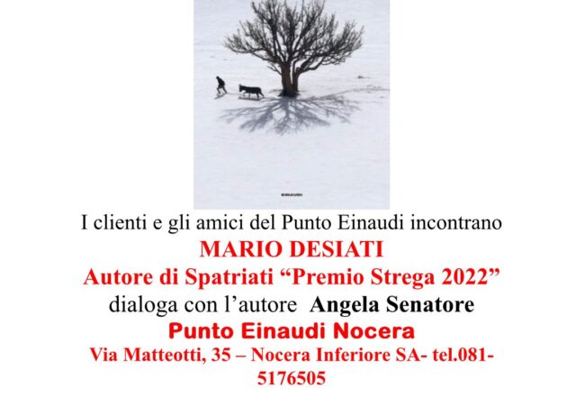 La prima Serata Einaudiana si terrà oggi 9 maggio alle 18.30 presso il Punto Einaudi di Nocera Inferiore: lo scrittore pugliese Mario Desiati presenterà per la prima volta in provincia di Salerno il suo nuovo libro “Malbianco”. L’autore Premio Strega 2022 sarà accompagnato dall’avv. e giornalista Angela Senatore, redattrice di Ulisse on line.