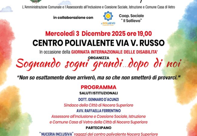 Con “Sognando sogni grandi… dopo di noi”, Nocera Superiore riafferma la propria vocazione a costruire una comunità inclusiva, attenta ai bisogni di tutti e capace di trasformare la sensibilità in azioni concrete.