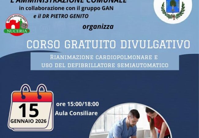L’iniziativa, patrocinata dall’Amministrazione e realizzata in collaborazione con il Gruppo Archeologico Nuceria e il dottor Pietro Genito, offrirà ai partecipanti nozioni teoriche e competenze pratiche fondamentali per intervenire tempestivamente in caso di arresto cardiaco.
