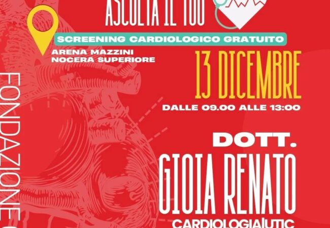 Nocera Superiore continua a mettere al centro la prevenzione e il benessere dei cittadini con un nuovo appuntamento dedicato alla salute. Sabato 13 dicembre 2025, presso l’Arena Mazzini, si terrà l’iniziativa “Ascolta il tuo Cuore”, la giornata di prevenzione dedicata alle patologie cardiovascolari.