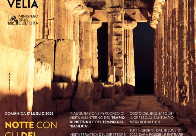 Nella serata di domenica 17 luglio 2022, verrà inaugurato nell’area archeologica di Paestum il percorso di visita all’interno del tempio di Nettuno e del tempio di Hera, la cosiddetta “Basilica”, nell’ambito delle aperture straordinarie del Parco Archeologico di Paestum e Velia promosse dal Ministero della Cultura.