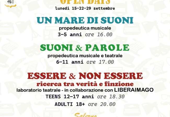 Partono il 15 settembre -e proseguono il 22 e il 29 settembre- negli spazi dell’Ex Chiesa di Sant’Apollonia, nel cuore del centro storico di Salerno, gli Open Day gratuiti dei percorsi educativi e formativi promossi da Ablativo – associazione culturale ETS. Alle 16.00 si partirà con “Un mare di suoni”, percorso di propedeutica musicale dedicato ai bambini dai 3 ai 5 anni che unisce gioco ed esplorazione musicale. Alle 17.00 sarà la volta di “Suoni & Parole”, per bambini dai 6 agli 11 anni, che unisce propedeutica musicale e teatrale con attività ritmiche evocali, giochi teatrali e narrativi. Si entrerà poi nel vivo di “Essere & Non Essere”, laboratorio teatrale realizzato in collaborazione con la compagnia Liberaimago, con due percorsi distinti: alle 18.30 l’appuntamento è dedicato ad adolescenti dai 12 ai 17 anni; alle 20.00 appuntamento con il gruppo adulti dai 18 anni in su.