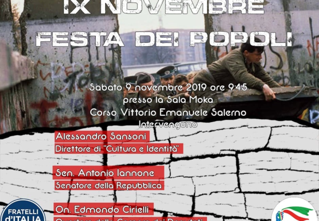 Sabato 9 novembre alle ore 9:45, presso la Sala Moka in Corso Vittorio Emanuele aSalerno, si terrà la manifestazione provinciale di Gioventù Nazionale – Fratelli d’Italia, “IX NOVEMBRE: FESTA DEI POPOLI” per commemorare i trent’anni della Caduta del Muro di Berlino.