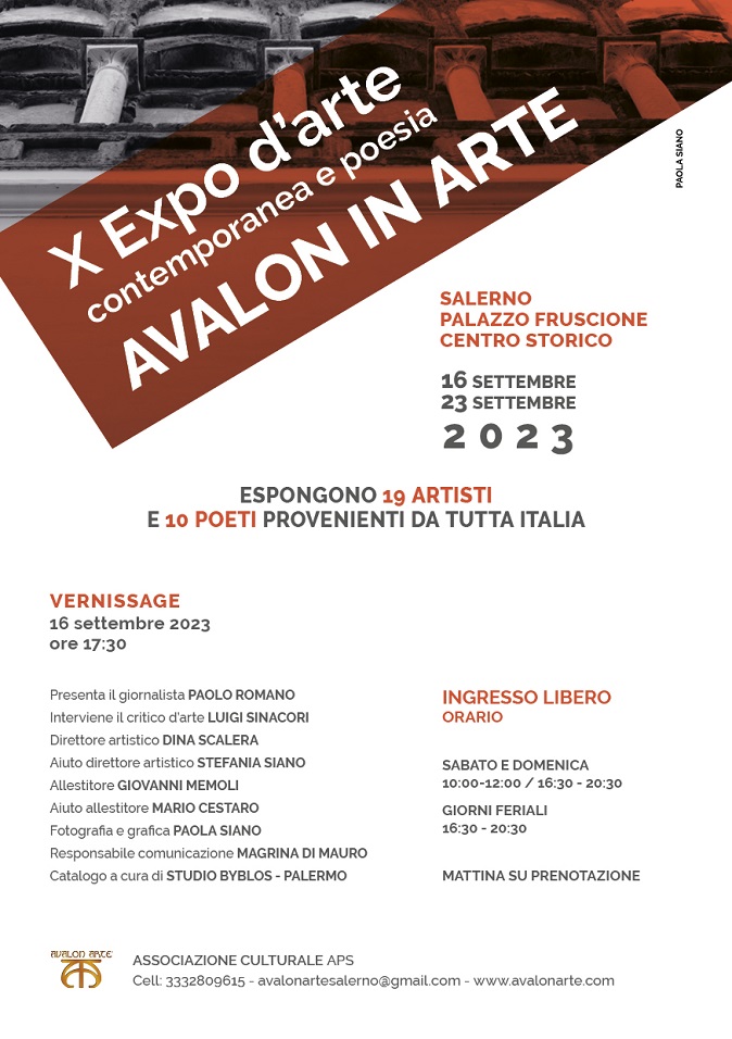 Dal 16 al 23 settembre si terrà la X edizione dell’Expo d’Arte Contemporanea e poesia “Avalon in Arte”, organizzata dall’Associazione Culturale “Avalon Arte APS” di Salerno. L’esposizione, patrocinata dal Comune di Salerno, si svolge presso Palazzo Fruscione – Vicolo Adelberga (ad. Via Dei Canali) nel cuore del centro storico.