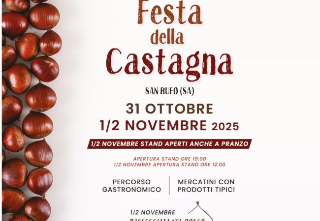 Dal 31 ottobre al 2 novembre, San Rufo torna ad accogliere la “Regina delle Sagre”: la XXII edizione della Festa della Castagna, presentata ufficialmente presso l’Aula Consiliare del Comune. L’evento, inserito nel progetto “Viaggio nel Vallo di Diano”, promette tre giorni di sapori autentici, escursioni nel bosco, mercatini, musica e spettacoli dal vivo.