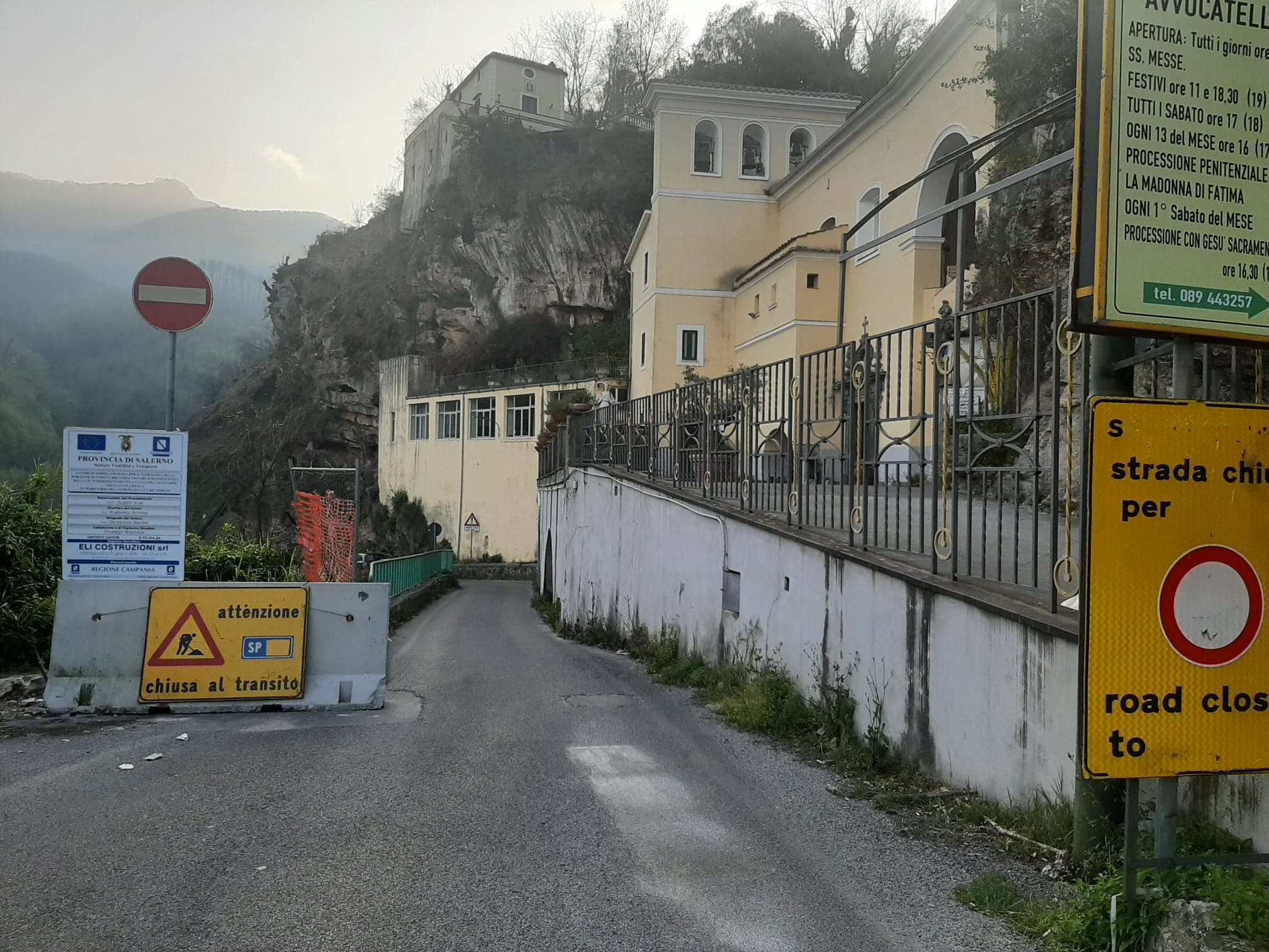 Sono già stati sistemati nella zona interessata, sia sul tratto della frazione di San Cesareo per quanto riguarda Cava, che su quello della frazione di Dragonea per quanto concerne Vietri, i cartelloni che vietano il transito ai veicoli e ai pedoni e verrà presto allestito il cantiere che porterà alla chiusura totale della strada. Attualmente la recinzione metallica è ancora aperta per permettere ai numerosi residenti della zona di usufruire, dopo ben 7 mesi di attesa, della carreggiata che è strategica per migliaia di abitanti dei due Comuni.