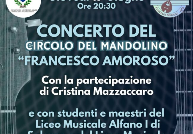 Giovedì 19 giugno 2025, alle ore 20.30, la splendida Villa Comunale di Vietri sul Mare si trasformerà in un salotto musicale sotto le stelle per accogliere il Concerto del Circolo del Mandolino, promosso dall’Associazione di Promozione Sociale “Circolo del Mandolino – Francesco Amoroso”, in collaborazione con il CTA Salerno e l’Associazione Salerno Legge, con il patrocinio morale del Comune di Vietri sul Mare.
