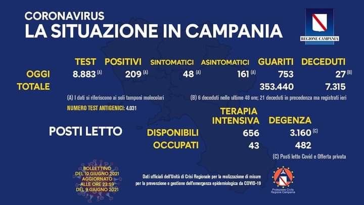 Questi i dati relativi ai casi di contagio di coronavirus alle ore 18 di ieri giovedì 10 giugno 2021.