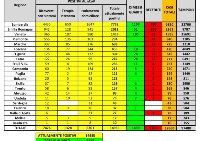 I deceduti sono 1.266, questo numero, però, potrà essere confermato solo dopo che l’Istituto Superiore di Sanità avrà stabilito la causa effettiva del decesso.