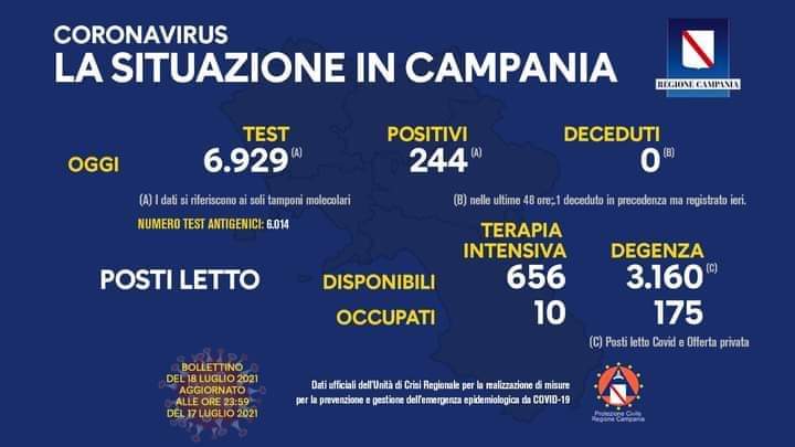 Questi i dati relativi ai casi di contagio di coronavirus alle ore 18 di ieri domenica 18 luglio 2021.
