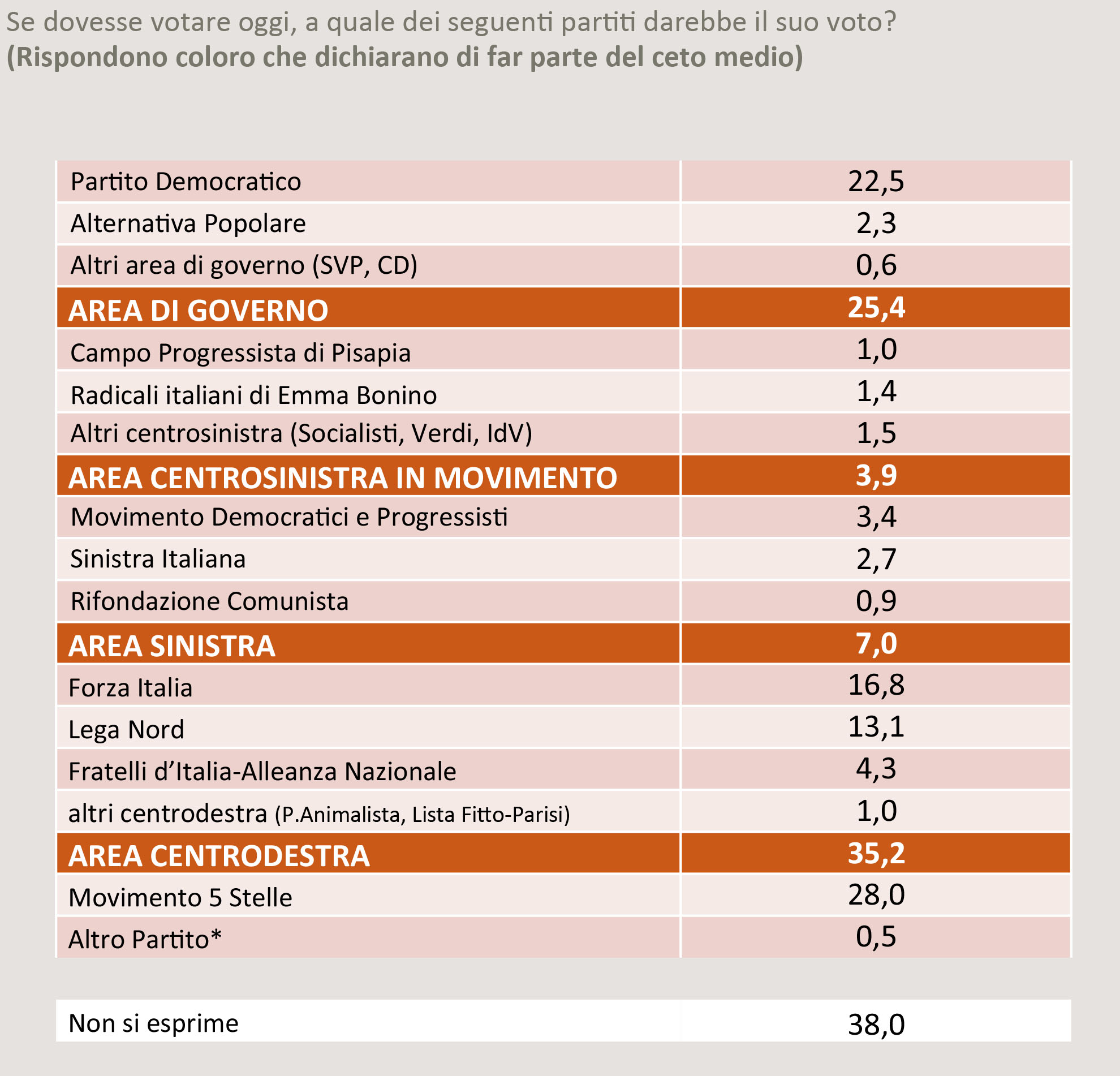 Da notare che un eventuale centrosinistra unito, compresi il Movimento Democratici e Progressisti di D’Alema e Bersani, Sinistra Italiana e Rifondazione Comunista, arriverebbe ad ottenre oltre il 36% dei consensi del ceto medio. Si tratta, però, solo di un’ipotesi di lavoro vista la frattura pressoché insanabile di questa sinistra con il Pd di Renzi.