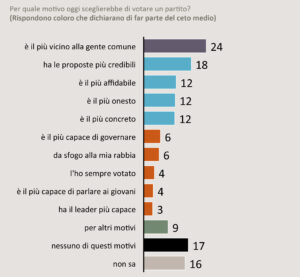 Mettendo a confronto le diverse motivazioni di voto del ceto medio, rispetto alla media della popolazione, scopriamo che in questo blocco sociale è più forte il driver della percezione di vicinanza alla gente (+5% rispetto alla media nazionale), mentre risultano più deboli altri elementi come la bravura del leader (-5% rispetto alla media), la capacità di governo (-4%) e l’ancoraggio alla tradizione familiare e personale (-2%)”.