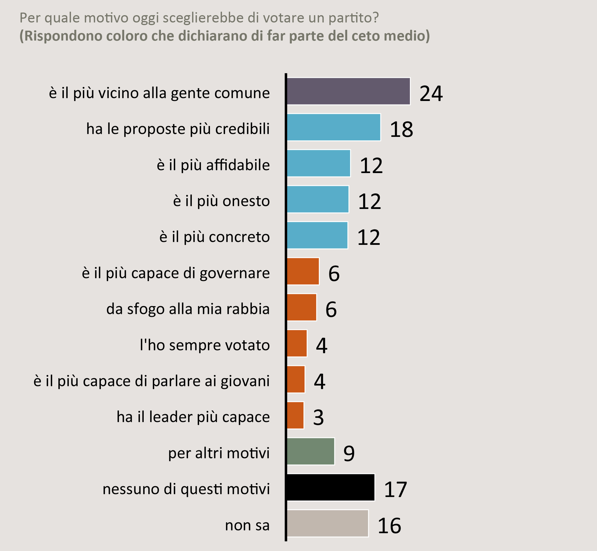 Ma quali sono le ragioni che determinato le scelte politico-elettorali del cento medio? Due sembrano essere le motivazioni più rilevanti. La prima è quella di scegliere un partito ritenuto più vicino alla gente comune (24%). La seconda quella di preferire il partito che sembra avere le proposte politiche più credibili (18%).