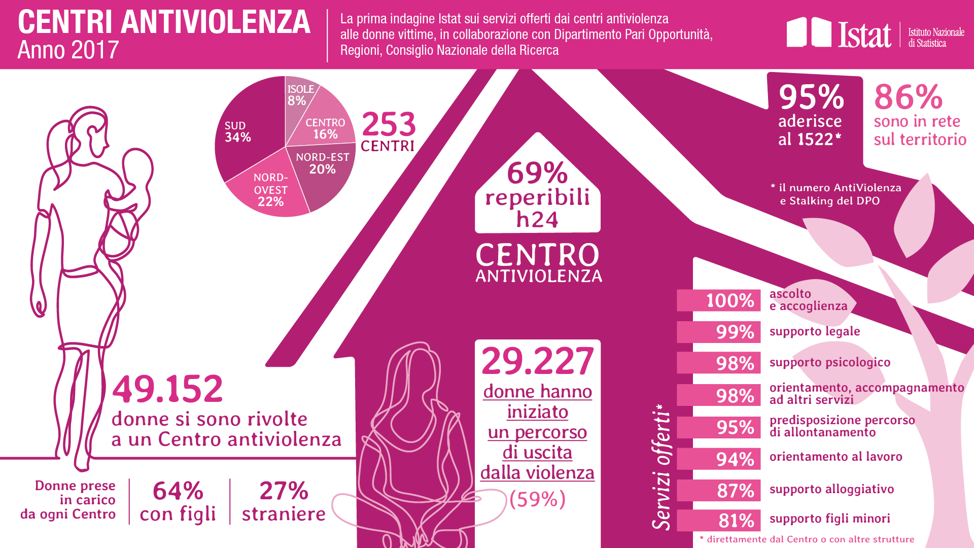 Le donne che nel 2017 si sono rivolte ai Centri antiviolenza sono 49.152, di queste 29.227 hanno iniziato un percorso di uscita dalla violenza. Il numero medio di donne prese in carico dai centri (115,5) è massimo al Nord-est (170,9) e minimo al Sud (47,5). Il 26,9 delle donne è straniera e il 63,7% ha figli, che sono minorenni in più del 70% dei casi.