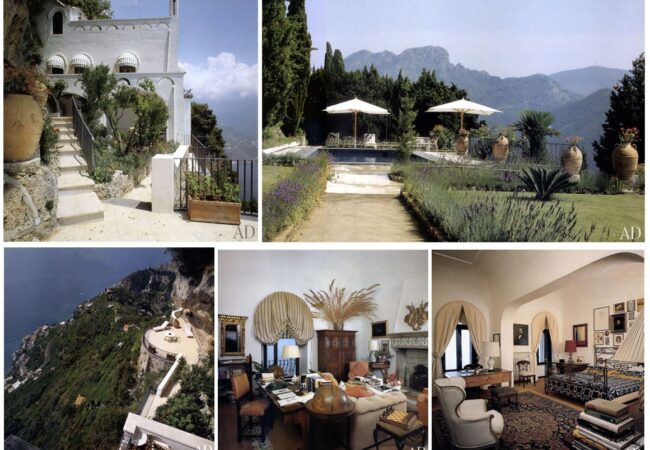 – MONTAGGIO DI 5 FOTO: La “Rondinaia”. Da sin in alto in senso orario: uno degli ingressi. La piscina costruita nel 1984. La camera da letto di Austen. Lo studio di Gore Vidal. Lo strapiombo sul mare – Foto tratte da architecturaldigest.com (articolo del 1994)